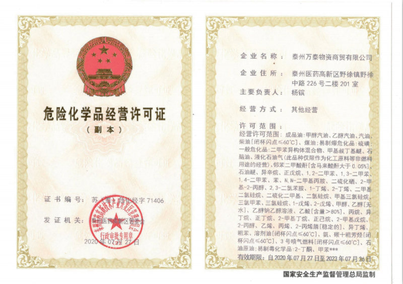 因受新冠肺炎疫情影響,國家相關(guān)政策規(guī)定,7月份之前未組織危化品生產(chǎn)經(jīng)營相關(guān)的安全職業(yè)培訓(xùn)及考試,導(dǎo)致萬泰公司一直無法獲得相關(guān)經(jīng)營資質(zhì)。萬泰公司始終與培訓(xùn)考試機構(gòu)保持著密切聯(lián)系,7月初收到了恢復(fù)培訓(xùn)考試的通知,第一時間組織員工參與,并成功通過了考試。隨后,萬泰公司又積極與主管部門取得聯(lián)系,及時報送相關(guān)評審材料,主動配合主管部門的審查工作。通過不懈的努力,于2020年7月27日取得了危險化學(xué)品經(jīng)營許可證,這也標(biāo)志著萬泰公司獲得了進入化工貿(mào)易領(lǐng)域的通行證。