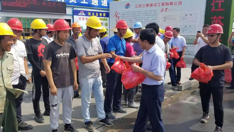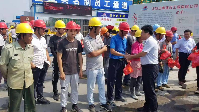 連日來,我市烈日當(dāng)空,持續(xù)高溫,為改善夏季工作條件,對依舊堅持在烈日下工作的一線職工表達(dá)敬意和關(guān)懷,加強高溫期間職工勞動保護(hù)工作,推動企業(yè)落實防暑降溫措施,2019年8月7日上午,醫(yī)藥高新區(qū)組織部部長葛立網(wǎng),住建局局長朱葉青、副局長洪一琤在華信公司董事長張由鳳、總經(jīng)理楊鑌等一行的陪同下來到康澤花園一期、醫(yī)藥城小學(xué)項目現(xiàn)場,對現(xiàn)場工作人員進(jìn)行高溫慰問,為這個炎熱的夏季送來清涼。