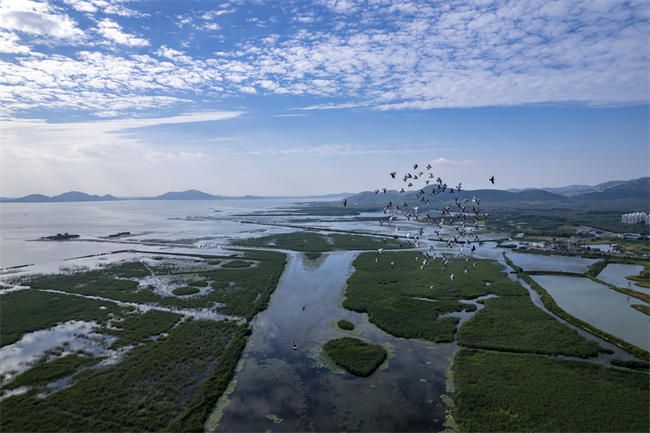 地遼天闊鳥(niǎo)競(jìng)飛,平湖薄霧映晴暉。初冬時(shí)節(jié),東平湖迎來(lái)首批南遷候鳥(niǎo),它們時(shí)而漫步淺灘,時(shí)而翱翔天際,動(dòng)與靜、力與美交織,染就一幅舒朗壯麗的天然景象。